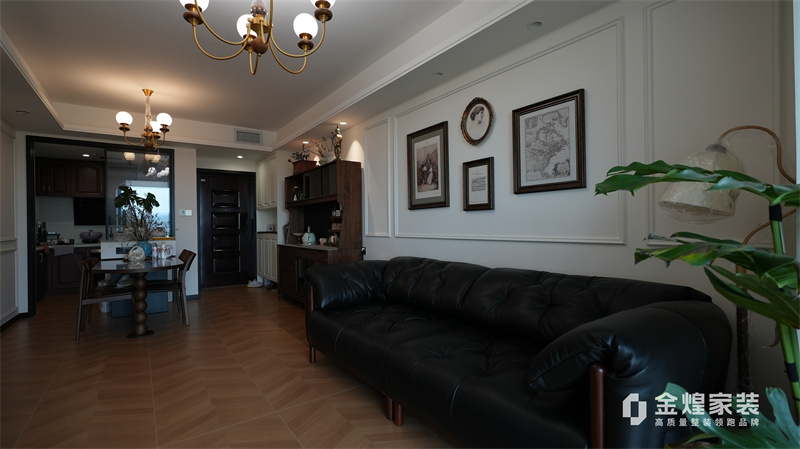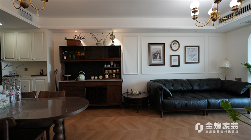 从客厅的深色皮质沙发、木质电视柜,到餐厅的玻璃餐桌、深色餐边柜,再到卧室的白色衣柜、深色木质床,都体现了中古风格对材质和色彩的选择偏好。