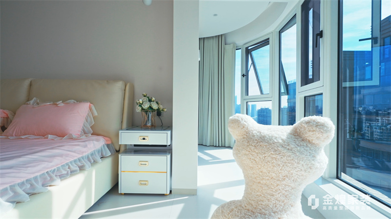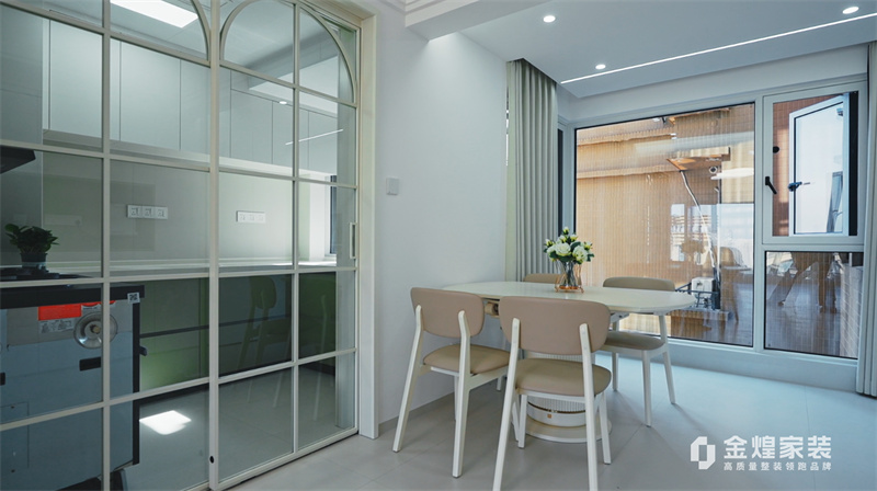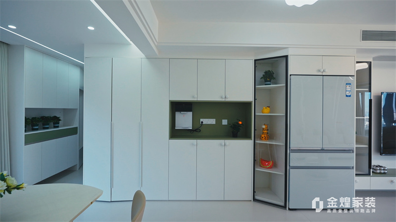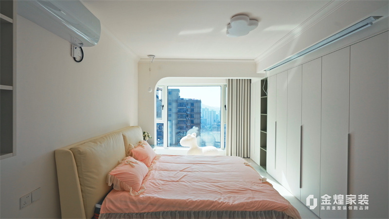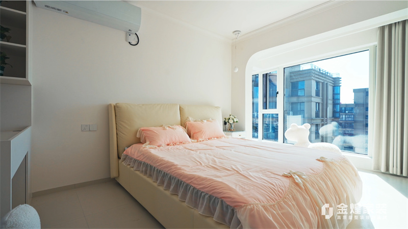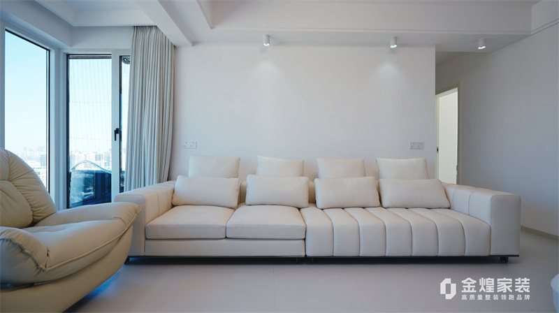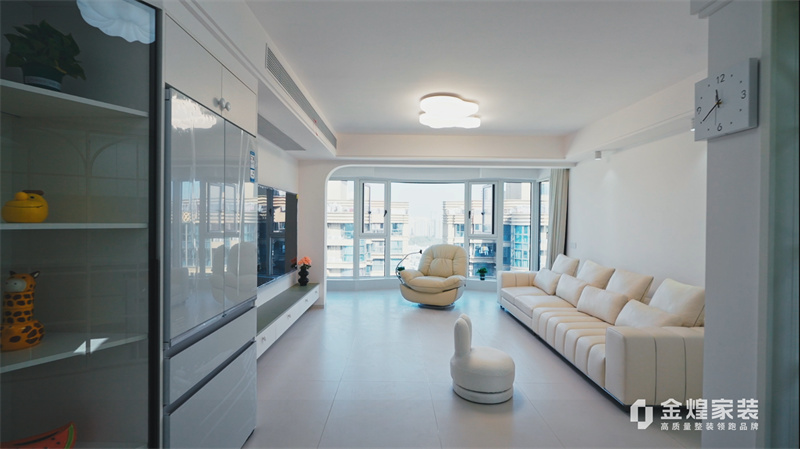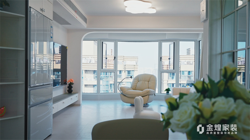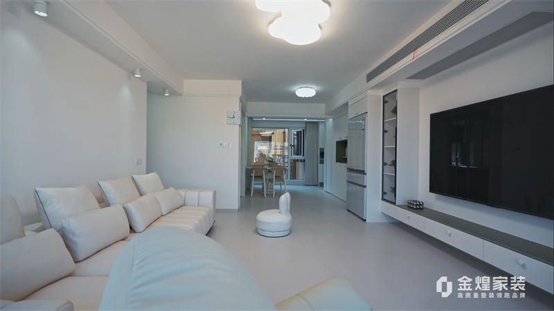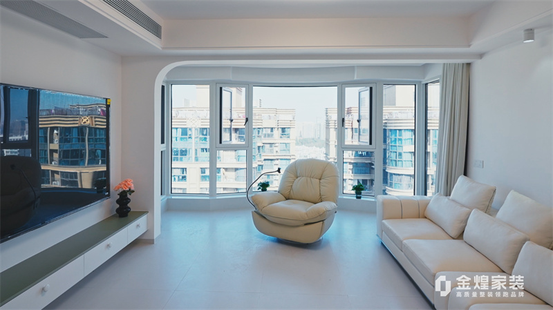 客厅内,大电视直接挂在墙上,下方配以简约的电视柜,旁边摆放着舒适的沙发和别致的休闲椅,没有过多的繁杂装饰,显得宽敞又明亮。大窗户的设计让室内光线充足,进一步增强了空间的通透感。