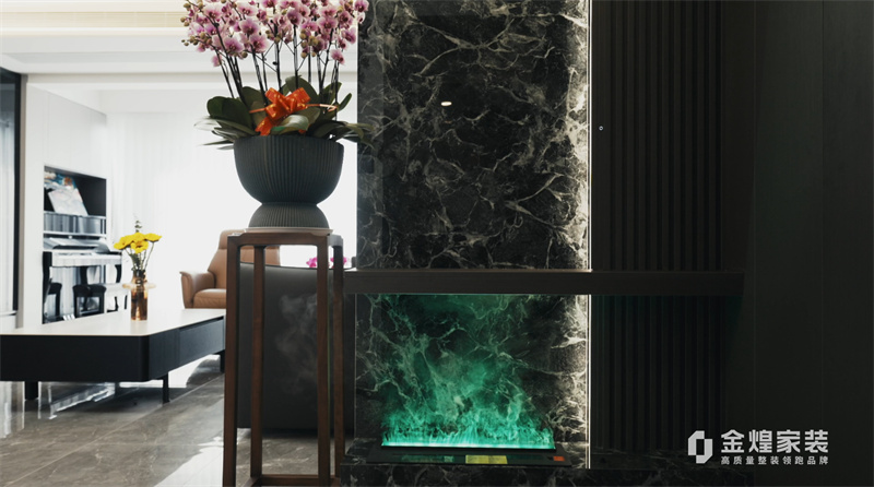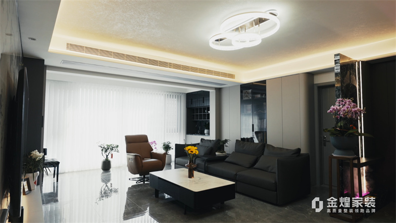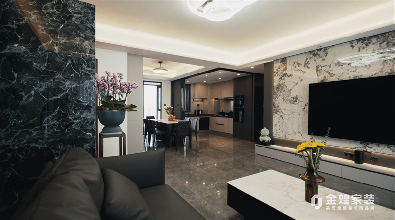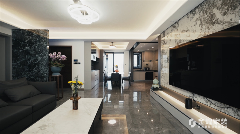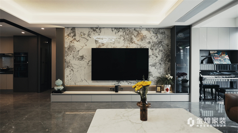 电视背景墙的大理石纹理、简洁的家具线条以及精心布置的灯光设计,都体现了现代轻奢风格的特点。同时,通过添加一些鲜花和装饰品,增加了空间的温馨感和生活气息。