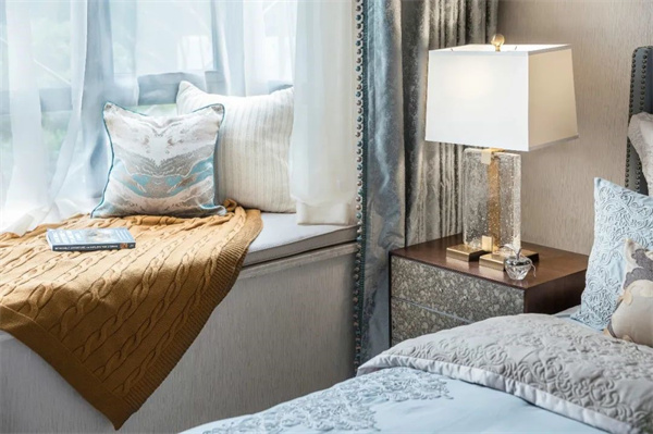 次卧以柔和的浅灰色和象牙白为主色调。床上铺设着柔软的棉麻床品,搭配着几只丝绸抱枕,带来舒适而奢华的触感。大窗户配有轻纱窗帘和厚重的绒布窗帘,既能保证充足的光线,又能在需要时提供私密性。