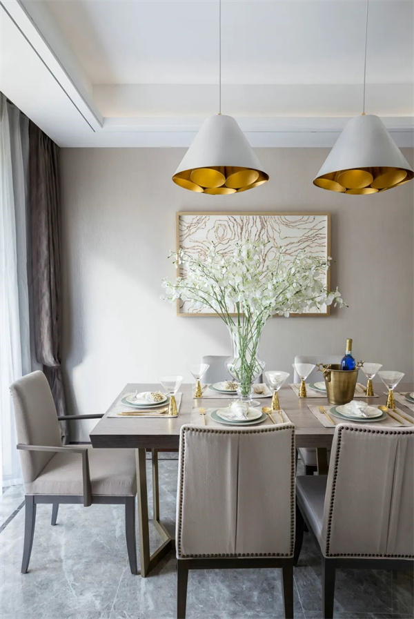 餐厅以浅色为主调,中央摆放着一张长方形仿木质纹理的餐桌,桌面光滑细腻,散发出低调的奢华感。上方悬挂着一盏华丽的水晶吊灯,搭配桌上精心布置的金色餐具、细瓷餐盘以及充满自然气息的鲜花,营造出温馨而浪漫的用餐氛围。