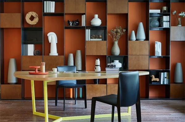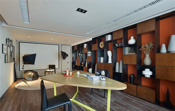 走进书房,被一整排书柜所吸引,大量艺术摆件展示主人品味与艺术素养。加上大量使用的橙色元素,使整个空间更加充满活力和生机,每一处细节都在呼应着整体的设计理念,既独具特色又不失和谐统一。