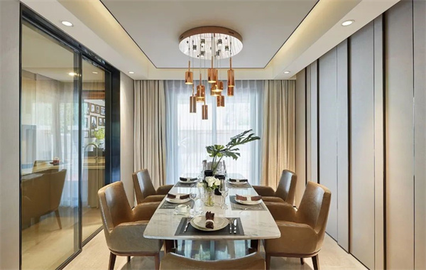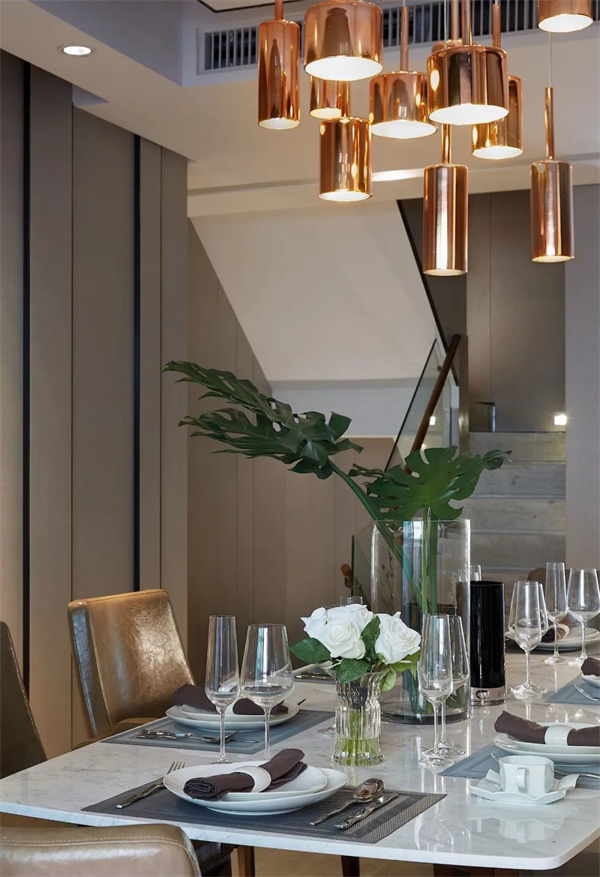 随着空间动线进入餐厅,皮艺餐椅与亮色大理石餐桌的搭配,轻松营造出轻奢优雅的氛围,加上线型黄铜吊灯的运用,让空间既有精致气息又不失温润质感。