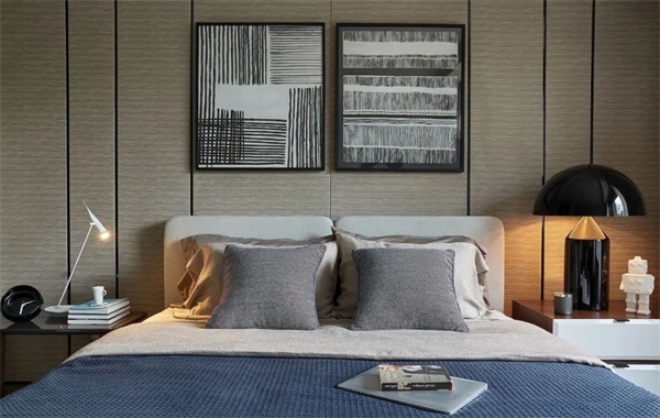 卧室床头墙是软质的布艺靠背,整体以灰、白色为基调,加入一组布艺画点缀,带来一种温暖而又优雅的氛围。床品选用了高品质的纯棉面料,柔软舒适,令人沉浸在舒适的睡眠中。