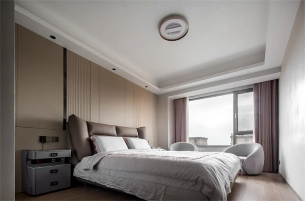 次卧的设计给人一种温馨时尚、舒适优雅的视觉体验。宽敞的窗户搭配两张单人沙发,为业主提供一个放松身心、阅读或休息的私密空间。精心设计的灯光效果进一步营造出温馨而又舒适的氛围。