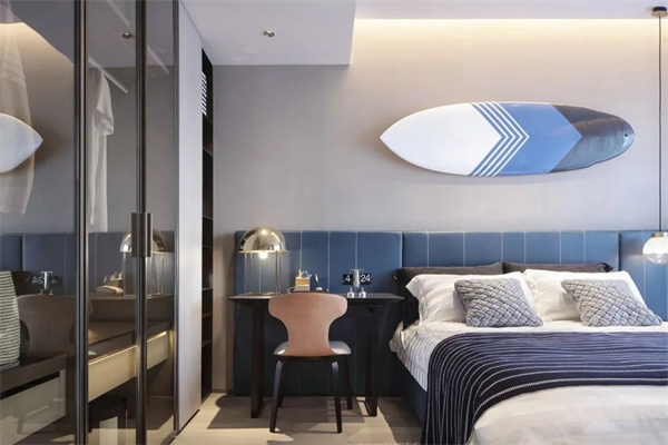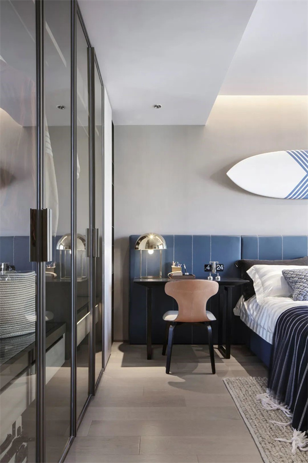次卧以浅灰色为主色调,搭配柔和的天蓝色软包床头,给人一种温馨时尚、舒适优雅的视觉体验。玻璃门衣柜是亮点,令所有衣物都明朗地呈现在眼前,让收纳从杂乱无章变得井井有条。