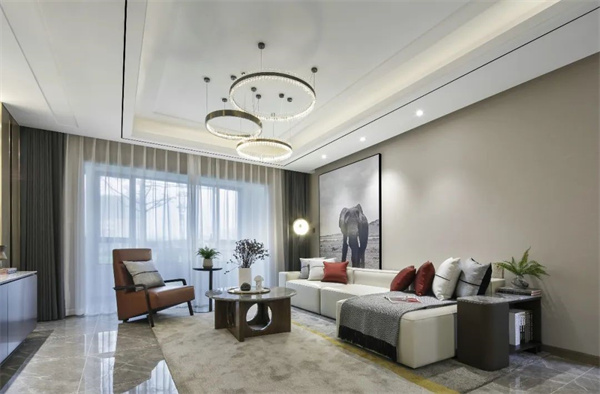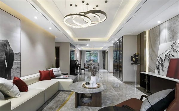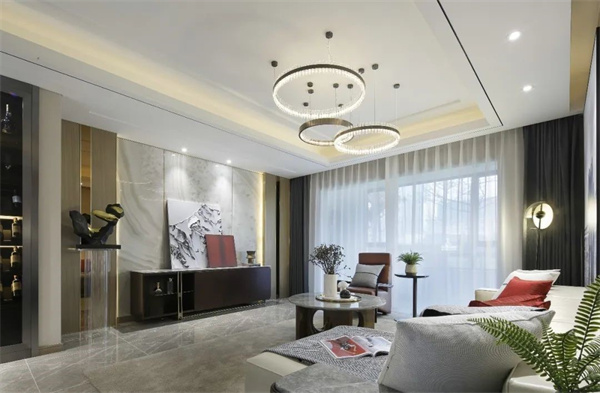 同时,客厅中巧妙融入了现代元素。简约现代的灯饰和软装配饰,让整个空间更加舒适和实用,也使整个客厅散发着温暖宜人的氛围。