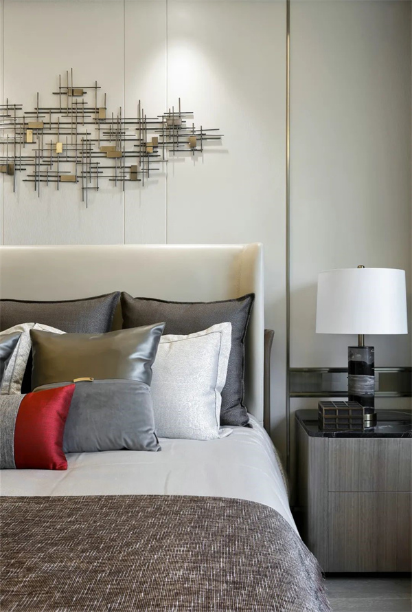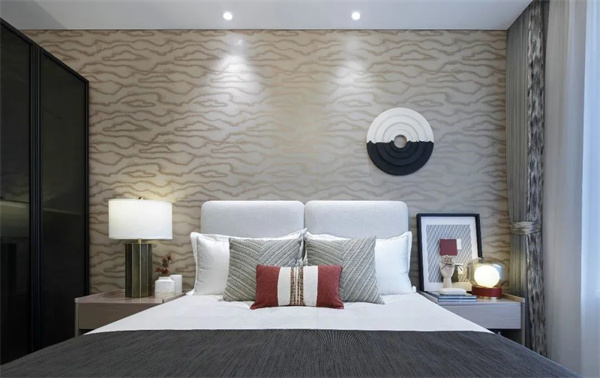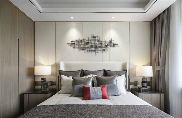 传统的中式元素与现代的简约设计完美结合,呈现出典雅与舒适的空间氛围。床头背景设计了一幅大型艺术背景装饰,为整个房间增添了一份艺术气息。大窗户让自然光线充盈房间,这样的主卧空间,不仅是休憩的港湾,更是文化与现代生活的完美融合。