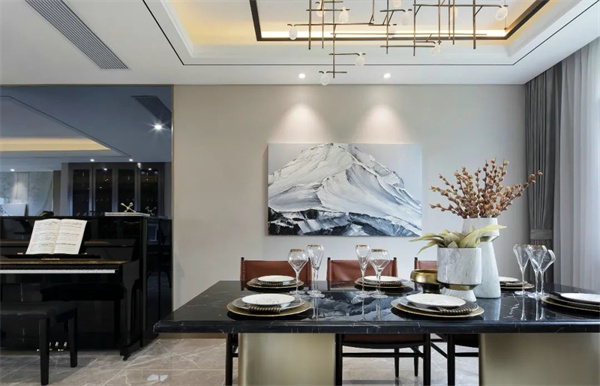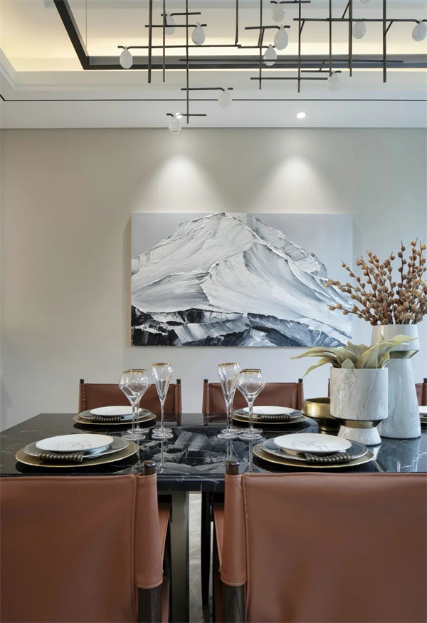 餐厅的餐桌椅采用深色调,融合传统工艺与现代简约线条,独具匠心。餐桌中央摆放着玻璃花瓶,里面插着新鲜的花卉,为餐厅增添了一份生机与色彩。顶部悬挂着精美吊灯,柔和的灯光洒在餐桌上,营造出温馨的用餐氛围。