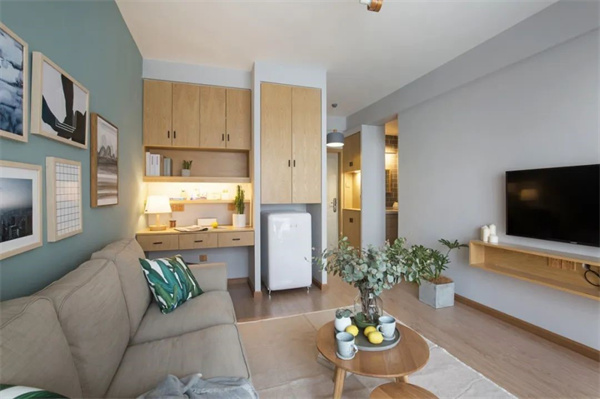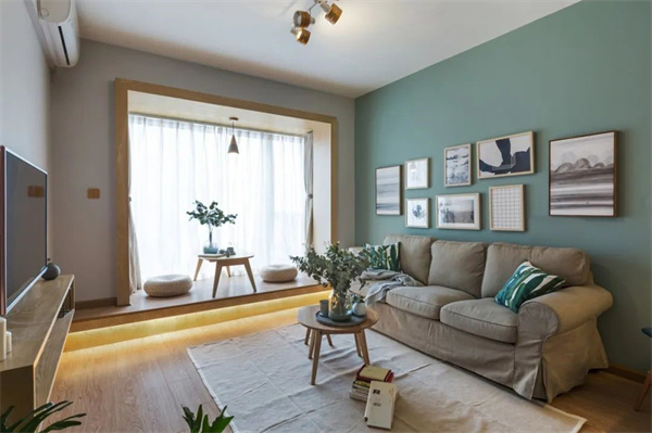 原木风格的客厅以舒适的布局为基调,使用大面积原木色与白色结合。经典奶白色+淡绿灰的墙面组合,搭配色彩朴素的软装饰品,再加上绿植和灯光布置,暖暖的灯光装饰,营造出一个温馨的氛围。