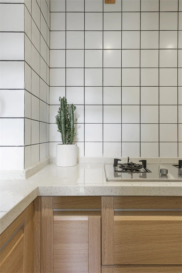 厨房的网红小白砖让人眼前一亮,木质橱柜与白色大理石台面相结合,既实用又富有现代感。定制化橱柜设计简洁而大方,增添一抹自然的美感,营造出一个既实用又舒适的烹饪空间。