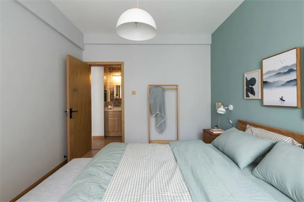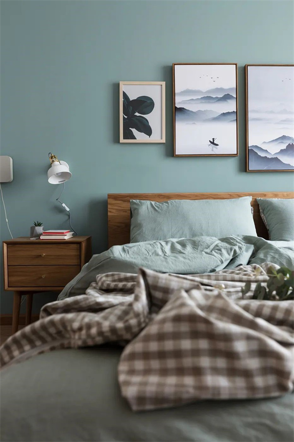 主卧以淡绿灰搭配天然木质的艺术挂画作为床头背景,配合同色系的床品,带来一种柔和的舒适感。原木床架质朴而富有质感,与淡绿灰的床品组合在一起,呈现出一种轻松自然的协调美。