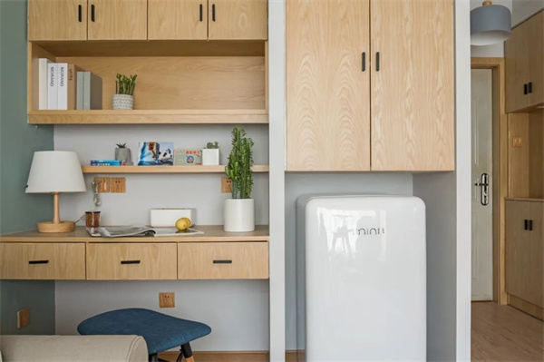 转角处,做开放式书房设计,以木质书桌和书架为主,温暖的木纹与清新的色调相互呼应,营造出一个可以放松思绪、感受自然气息的角落。