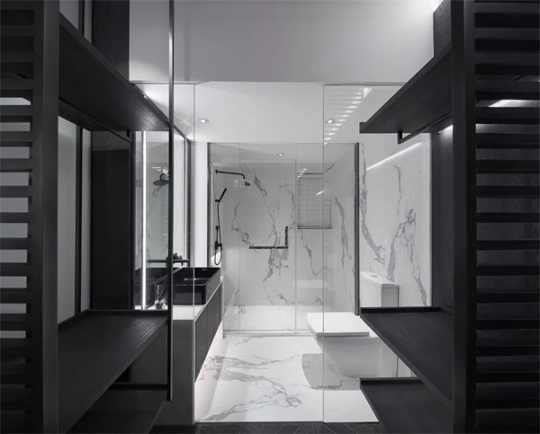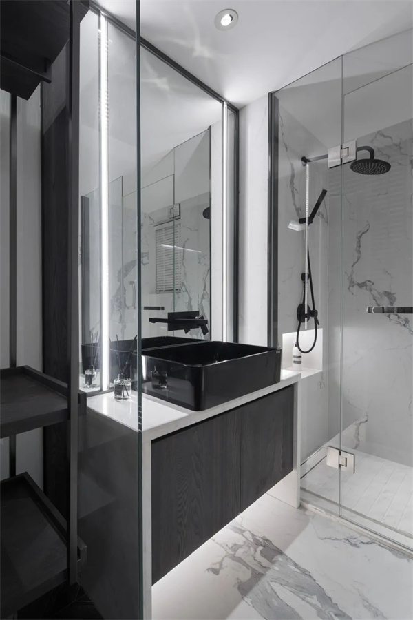 卫生间整体采用中性色调,干湿分离维持空间整洁。淋浴区采用透明玻璃隔断,进一步扩大了视觉空间感,同时突显出极简风格的功能性与时尚感。整个卫生间设计在冷静中展现了舒适与实用的完美平衡。