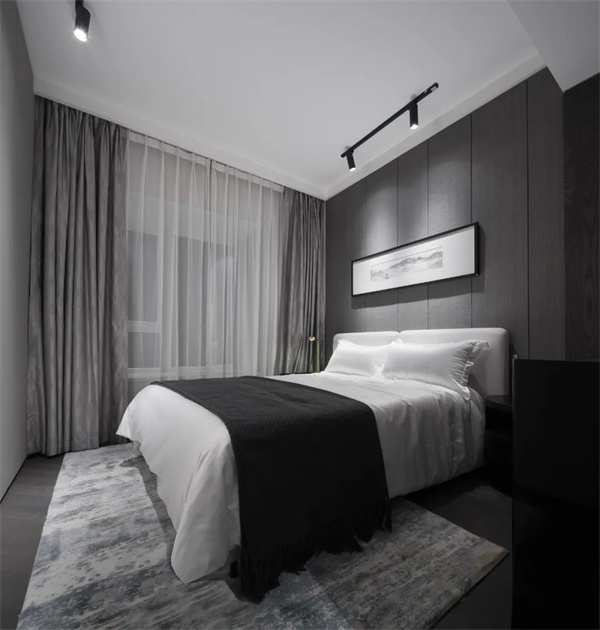 主卧深灰色的墙面与纯白的床品形成鲜明对比,宽大的床铺上铺满柔软的白色床品,营造出一个放松身心的休息角落。窗帘选用轻薄的白纱,轻柔的阳光透过窗帘洒入房间,赋予空间自然的明亮感,使主卧成为理想的放松与恢复能量的港湾。