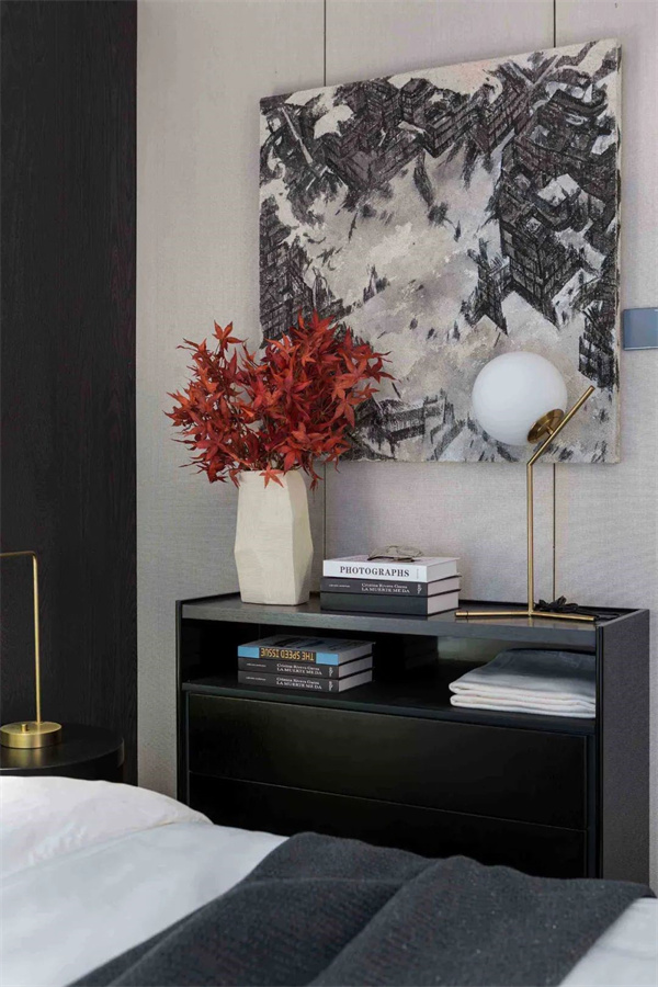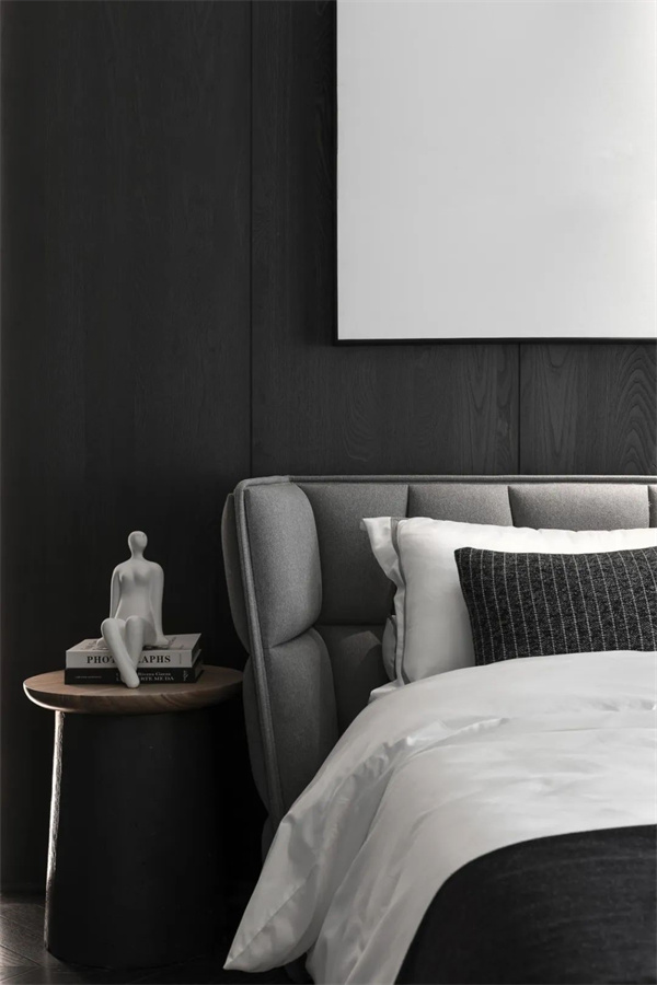 次卧延续了黑白灰的主色调,以简约的设计凸显现代感。简洁的床头背景墙上做了独特的抽象风格设计,与房间的整体氛围完美契合,增添了一抹艺术气息。