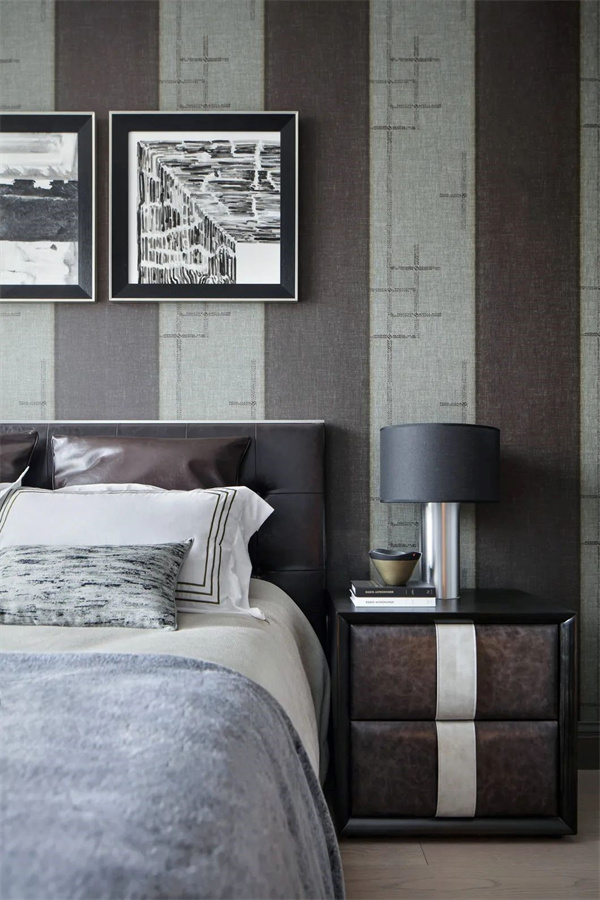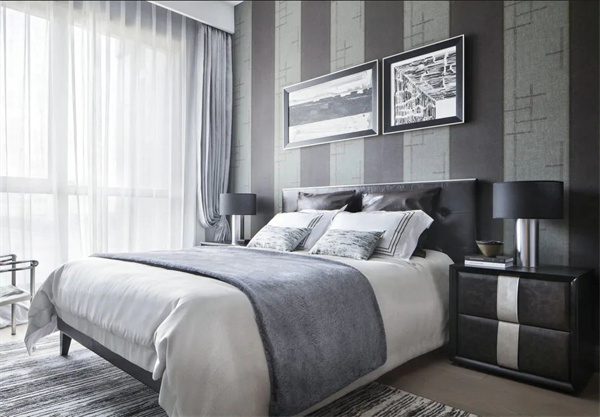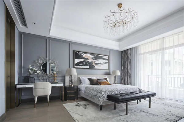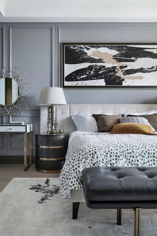 主卧以柔和灰白色搭配优秀的采光条件,营造出宁静舒适的空间感。床具选用软包设计,搭配天鹅绒或亚麻材质的床品,带来柔软而温暖的触感。卧室两侧的床头柜上摆放着复古台灯,灯光柔和,加上一张精巧的梳妆台,为主卧增添了几分法式的浪漫与惬意。
