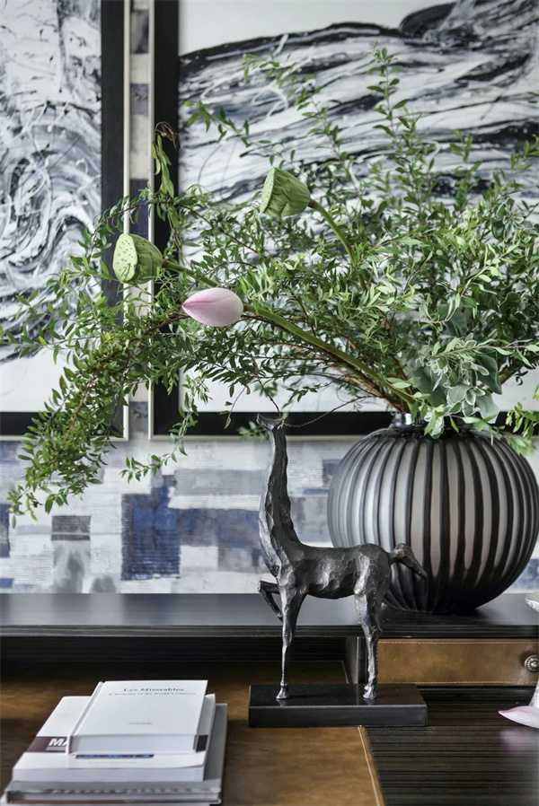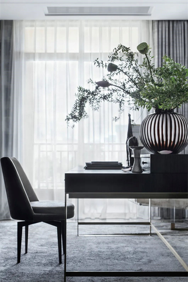 书房空间以温暖的米色和深色木质家具为主,带来宁静沉稳的氛围。书桌与书柜设计高挑大气,书籍、艺术摆件,营造出浓厚的书香气息。桌面点缀几株绿植,增添一抹清新,每一个细节都仿佛在诉说法式生活的从容与优雅。