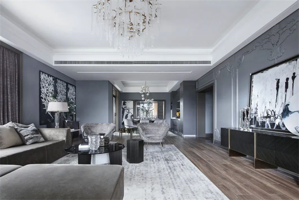 客厅浅灰色墙面装饰有简约的线条雕花,凸显出法式的古典美感。天花板上悬挂一盏华丽的水晶吊灯,在夜晚时映照出温馨的光辉。细节上,复古摆件、雕花镜框与精致的花卉装饰相互呼应,构成一个充满优雅与浪漫的空间,既舒适又具有浓厚的法式韵味。