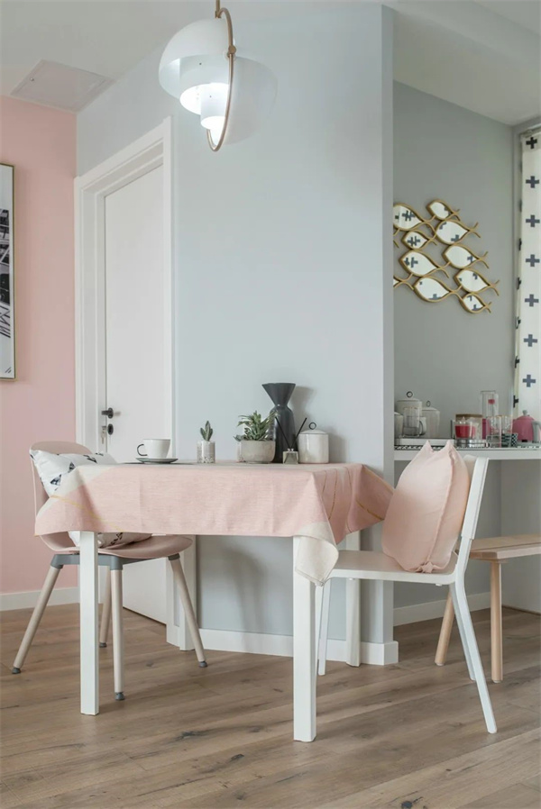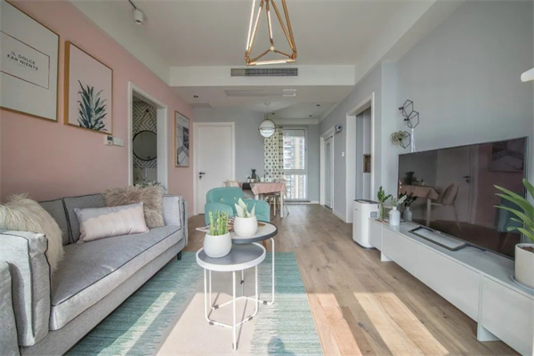 客厅墙壁采用粉色和天蓝色的巧妙组合,这种色彩搭配不仅增添了空间的层次感,还带来了一种温暖与宁静的对比美,两者相互映衬,营造出一种既温馨又清爽的视觉效果。