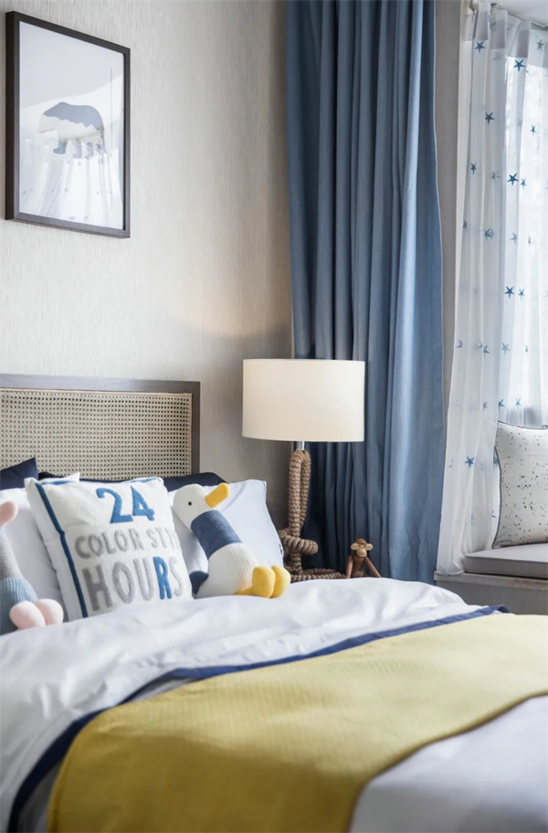 儿童房充满了童趣与温馨。房间的主色调为柔和的粉色和米白色,墙面上装饰着可爱的壁画和精致的装饰线条,床上铺设着柔软的棉质床品,配以可爱的卡通抱枕和玩偶,增加了房间的童趣,营造出一个梦幻般的童话世界。