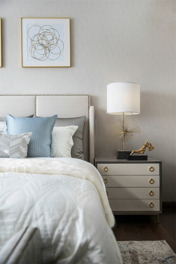 次卧以柔和的浅灰色和象牙白为主色调。床上铺设着柔软的棉麻床品,搭配着几只丝绸抱枕,带来舒适而奢华的触感。大窗户配有轻纱窗帘和厚重的绒布窗帘,既能保证充足的光线,又能在需要时提供私密性。