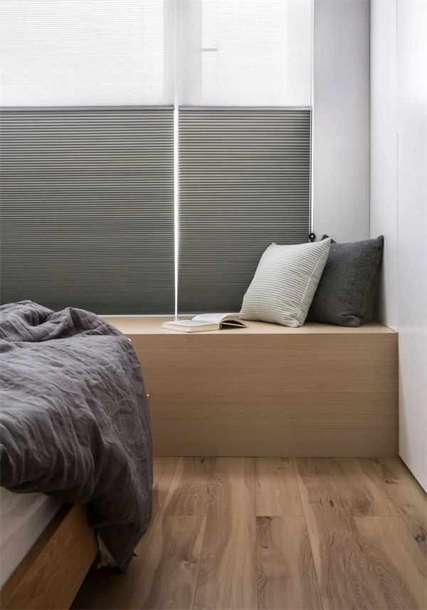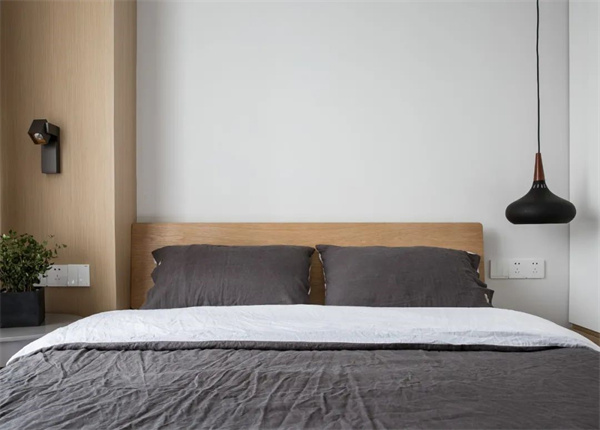 主卧空间以原木地板为基调,搭配白色墙面与灰自组合的床品,打造出简约而不失品位的氛围。选择原木饰面的家具,与整体设计风格保持一致,让主卧成为一个宁静而舒适的私人空间。