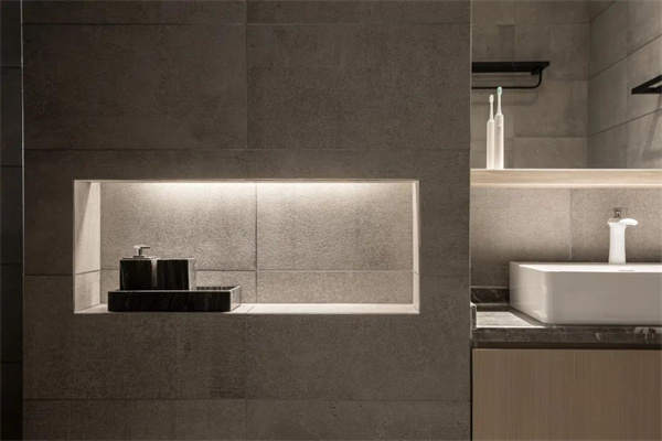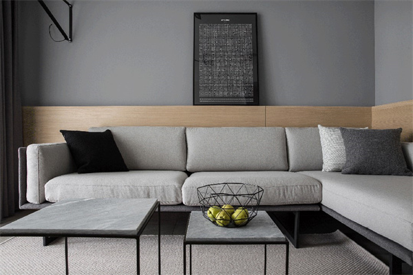 客厅设计以黑、白、灰的主色调为基础浅云白的墙面营造出通透感,灰色瓷砖地面搭配原木色饰面打破单调 ,赋予空间层次感。天花顶面装上筒灯,再明装导轨射灯配合灰色调软装布置呈现出一种极简大方的空间感。