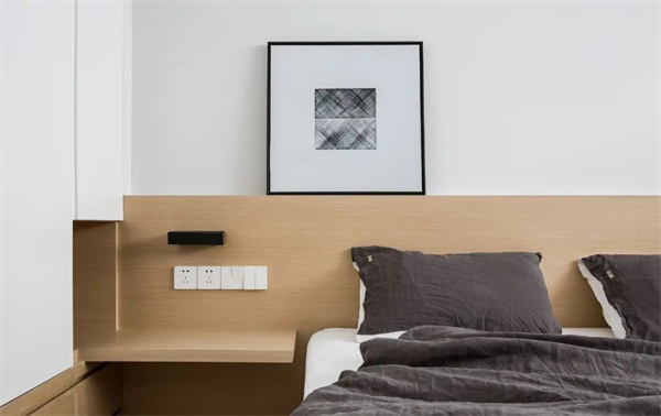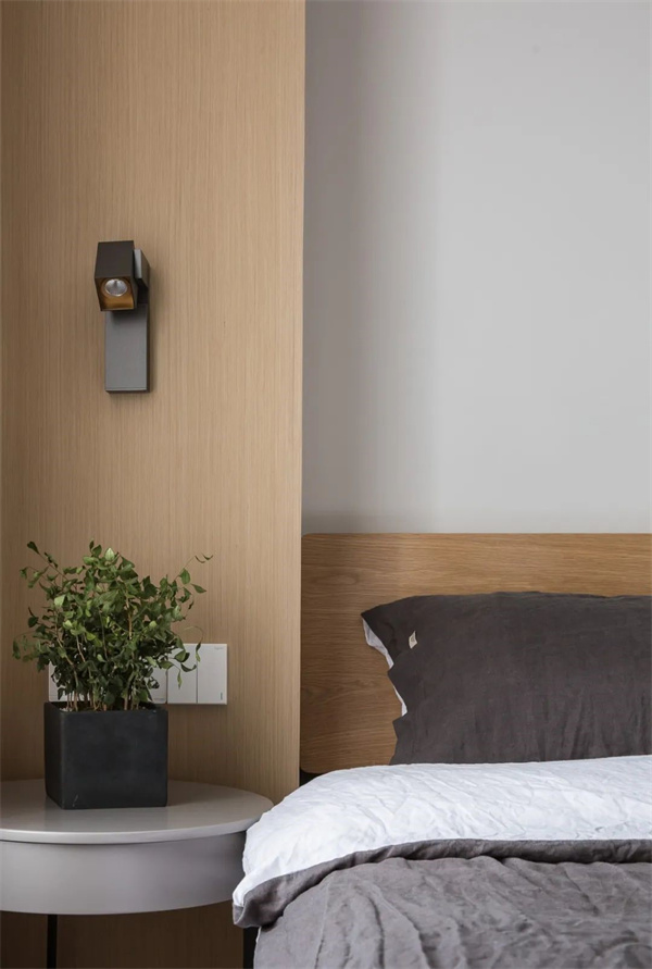 次卧中,白色墙面与原木色床头的组合,呈现清新自然的氛围。简约而实用的家具布局,使空间更加通透和整洁,加上柔和的灯光设计,让居住者尽情享受宁静与舒适。