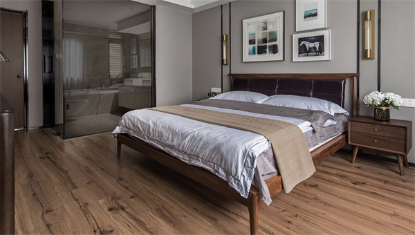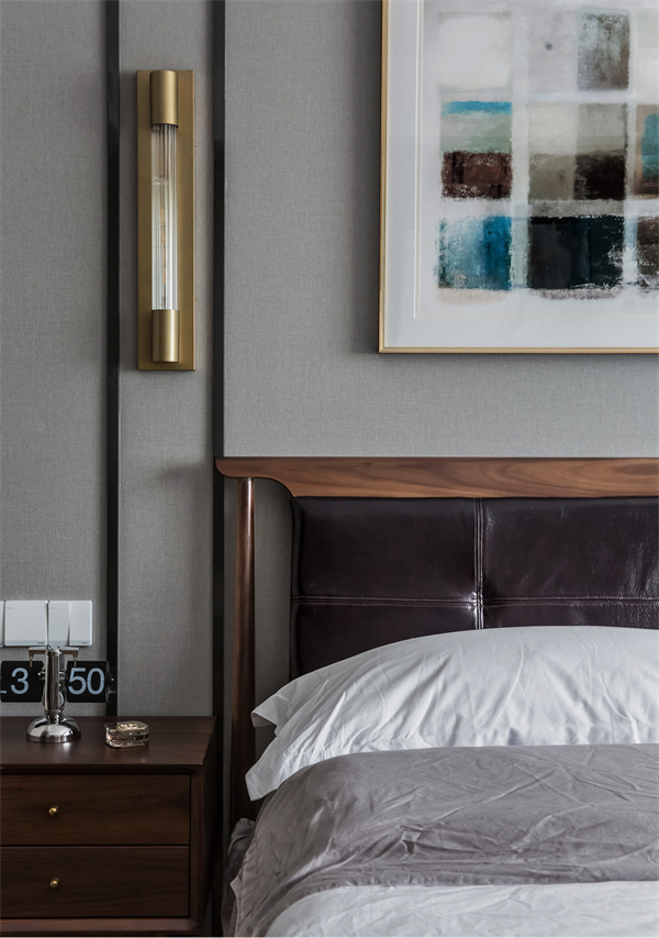 主卧以舒适为设计核心。选择原木色地板、灰白色墙面等柔和的色彩床品和家具,注重舒适度和简约美感。窗帘选用轻薄的材质,让自然光线充分渗透。床头背景墙个性化的装饰品和一组独特设计壁灯,为主卧空间增添一份温馨和艺术感。