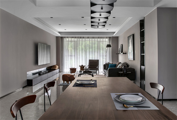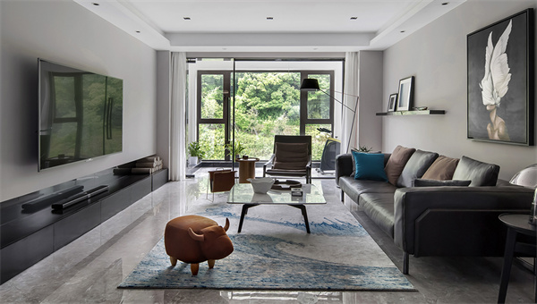 客厅以中性色为主基调,采用白色+灰色组合,通过大面积的窗户引入充足的自然光线。设计师选择了简洁线条的家具,搭配一些独特设计的艺术品和装饰画,营造出时尚而舒适的氛围,打造温馨空间。