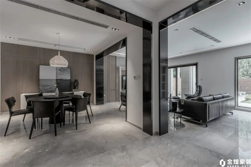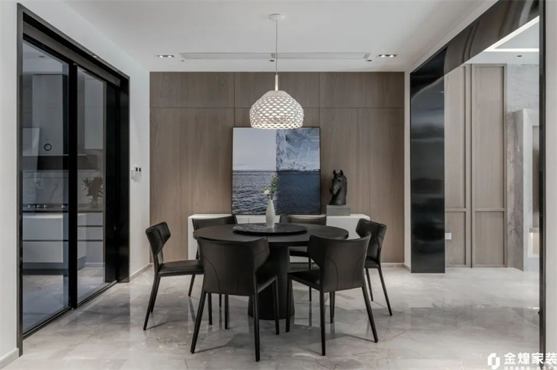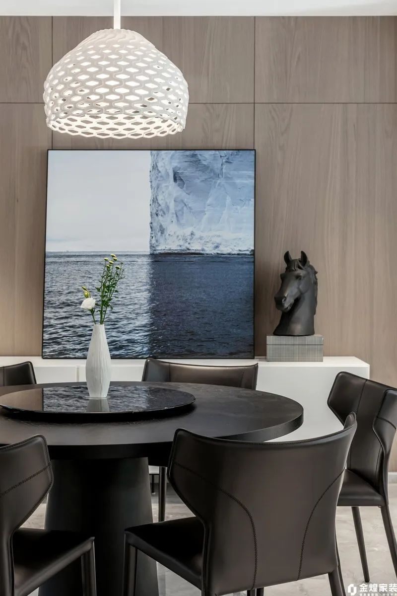 餐厅黑色餐桌椅与灰色大理石地板相得益彰,简洁大方;木质墙面和吊灯增添自然与温暖感。墙上艺术画作与雕塑摆件点缀其间,提升整体格调。无论是家庭聚餐还是朋友小聚,这里都能提供一个舒适、优雅的氛围。