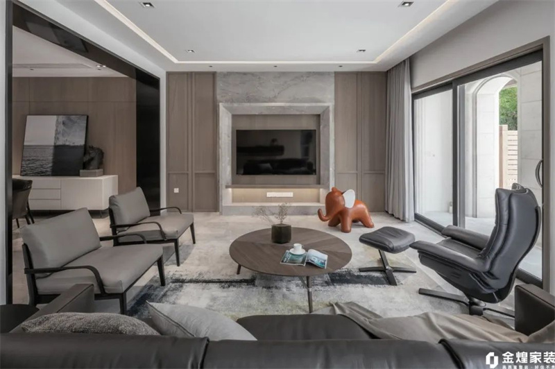 客厅墙壁和天花板都采用了纯白色装饰,营造出了通透的感觉。灰色布艺沙发柔软舒适,搭配黑色皮质单人椅和脚凳,形成鲜明的色彩对比,让整个空间显得更加生动有趣。大理石电视背景墙简洁大方,线条流畅,与整体风格完美融合。