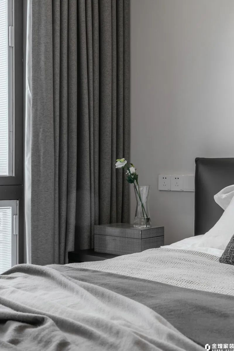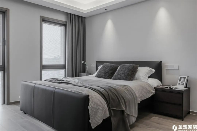 主卧室以木色地板搭配灰白墙面,包括床上用品,都采用了白色和灰色的组合,简洁而不失质感;大面积窗户引入自然光线,搭配灰色窗帘,增添一份柔和与私密感。整体设计既现代又温馨,是放松身心的理想之所。