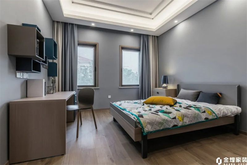 次卧延续了整个住宅的黑白灰现代风格,以淡灰色为主色调,营造出宁静的氛围。墙面和窗帘都是白色+淡灰色组合,一张简约而舒适的双人床与原木书桌和木色地板相配,增添了自然质感。
