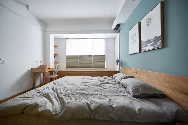 主卧室墙面是明亮的白色,蓝色的床头背景与灰色的床品组合,加上原木地板和实木家具,给空间带来清新的自然感。主卧室的照明设计考虑到了夜间舒适的用光需求,包括床头台灯和壁灯,打造完美的休憩空间。